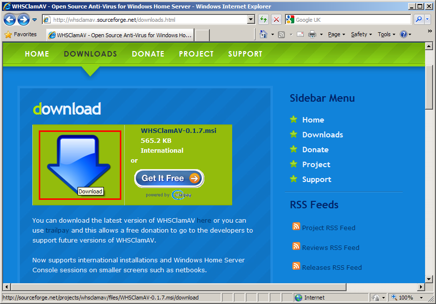 First go to http://whsclamav.sourceforge.net/ and click on Downloads: