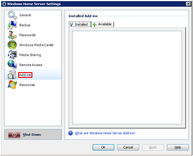 his will bring up the Widnows Home Server Settings Window, from here select the Add-Ins Tab: