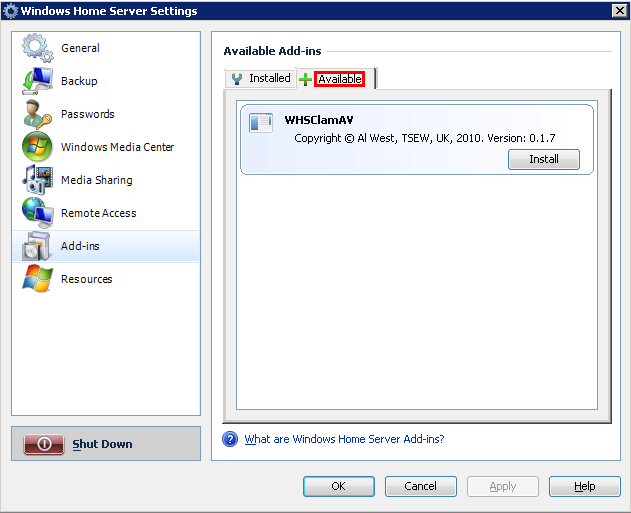 ou will see that WHSClamAV is not yet installed - you will have to click on the Available Tab to show WHSClamAV: