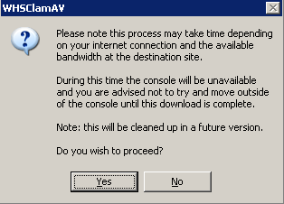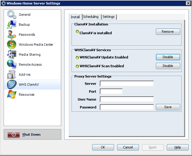e-open the Windows Home Server Console once it has closed and navigate back to the Windows Home Server Settings Window - this time select the "WHS ClamAV" tab: