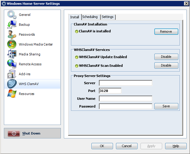 rom the Windows Home Server Settings Window select the WHS ClamAV Tab and select Remove: