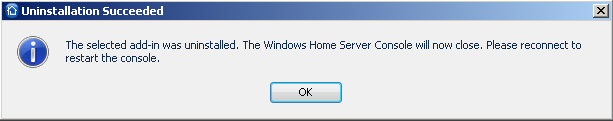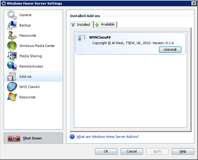ow move to the Add-Ins tab of the Windows Home Server Settings Window and click the "Uninstall" button for the WHSClamAV Add-In under the list of Installed Add-ins:
